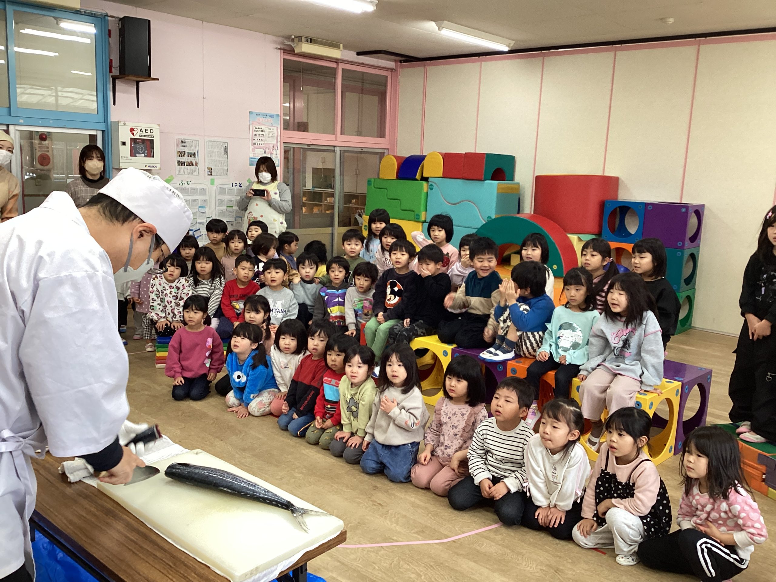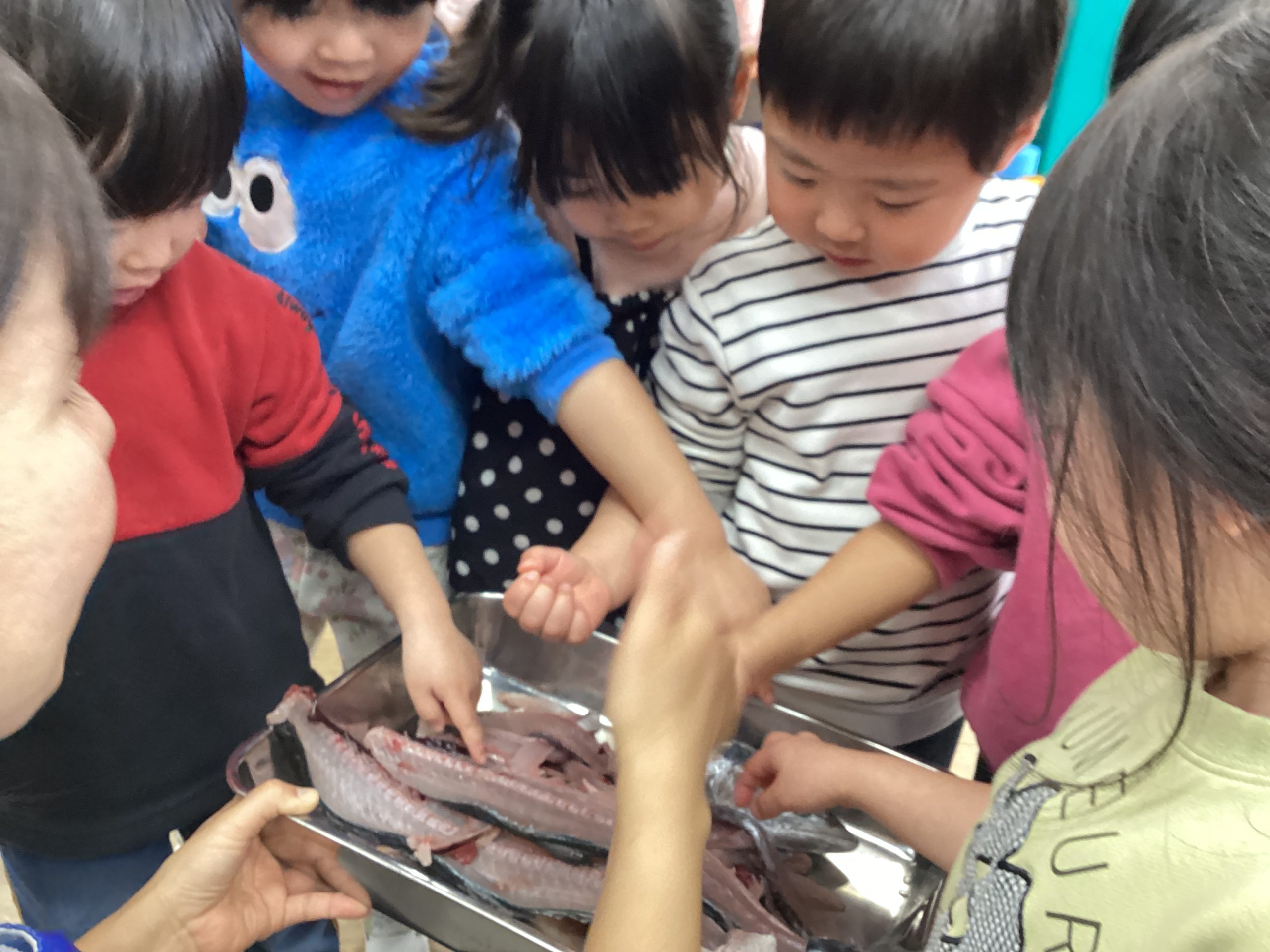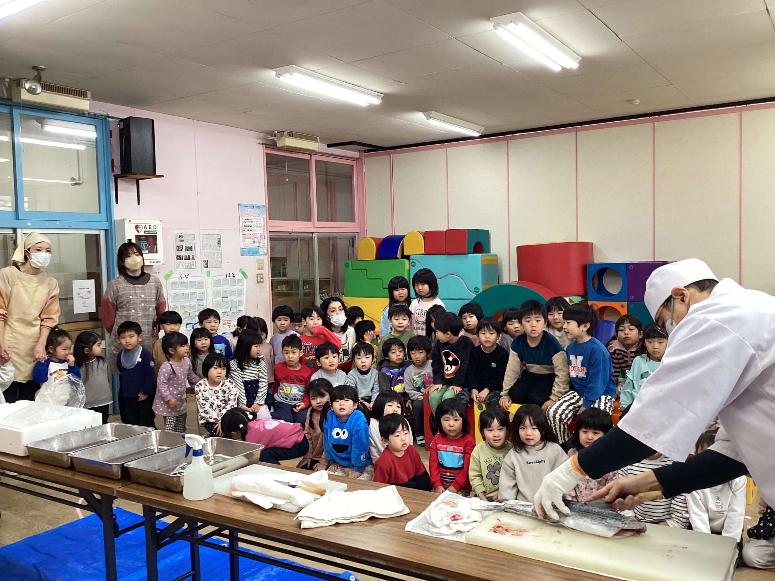 魚の教室では、ももぐみ・はとぐみ・はすぐみ・ふじぐみさんが魚を捌く様子を目の前で見ました。