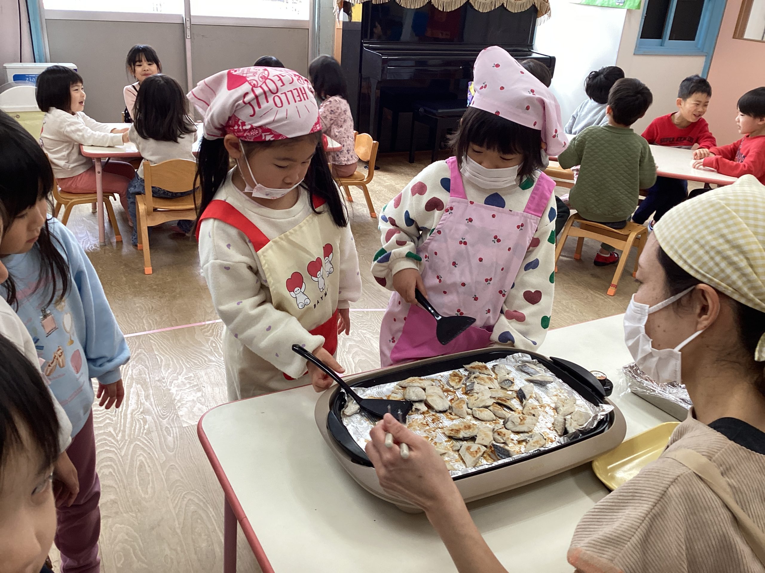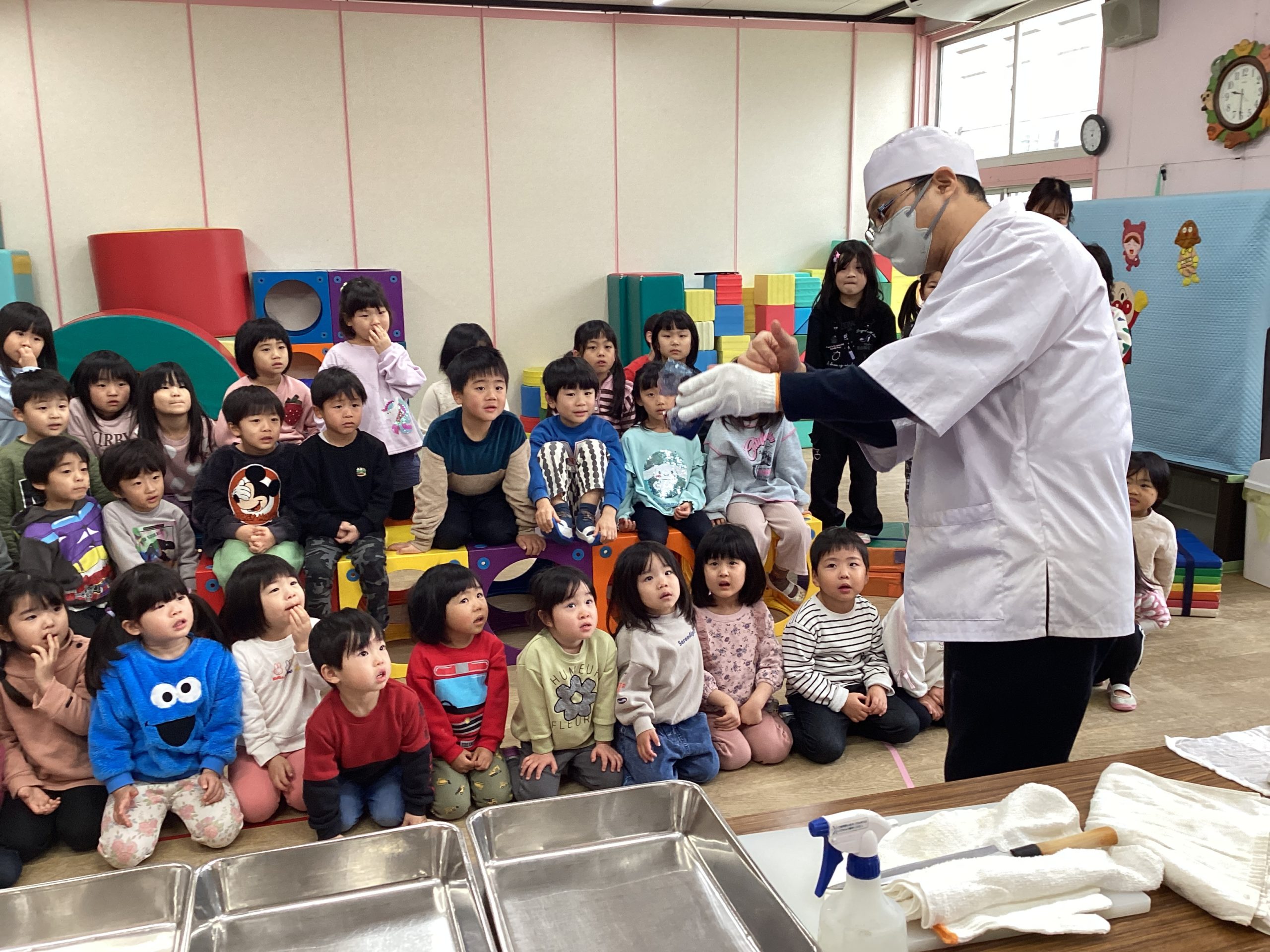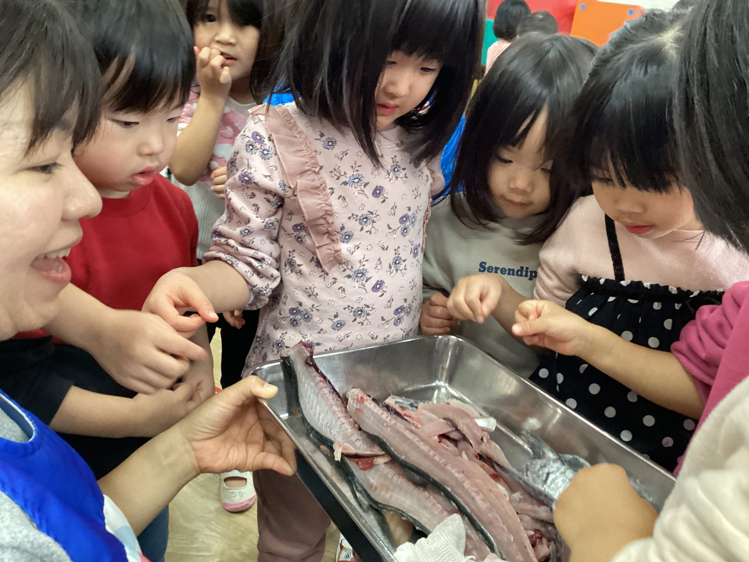 魚の教室では、ももぐみ・はとぐみ・はすぐみ・ふじぐみさんが魚を捌く様子を目の前で見ました。